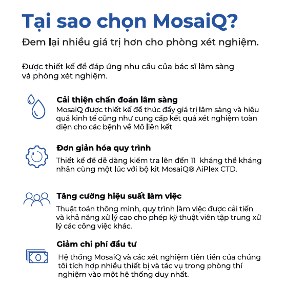 Hệ thống MosaiQ® cải tiến dễ dàng sử dụng được thiết kế để cung cấp xét nghiệm multiplex (đa tác nhân trên 1 panel), multimodel (nhiều panel chạy trên 1 hệ thống) với một mẫu bệnh nhân, mang lại giá trị kinh tế cho các phòng thí nghiệm trên toàn thế giới và rút ngắn thời gian phát hiện và chẩn đoán bệnh.